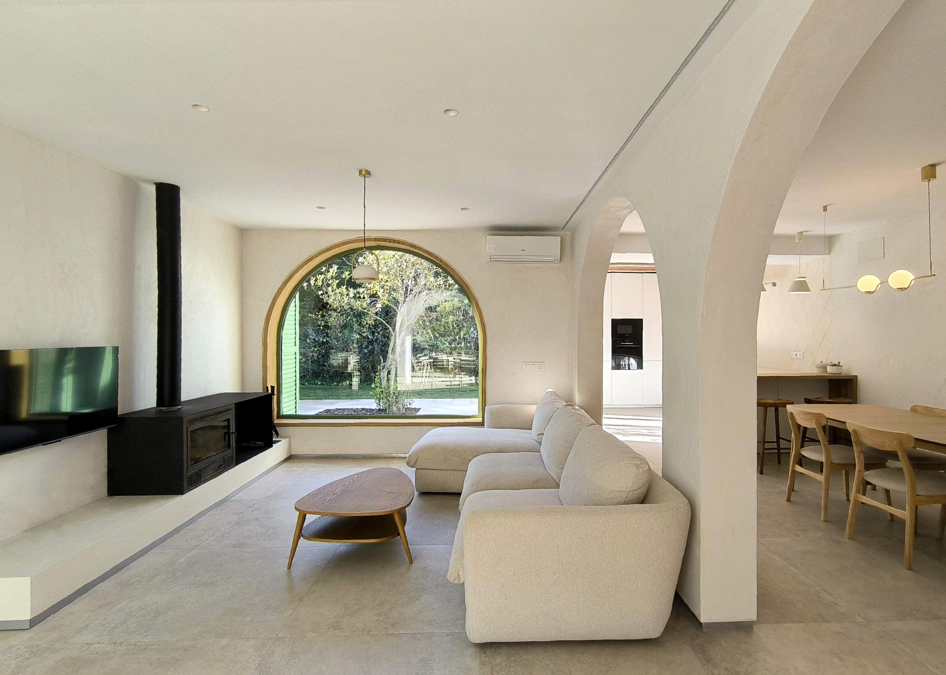 Siendo una casa para la desconexión y el disfrute, la zona de día debía ser un espacio completamente diáfano y abierto al exterior multiplicando los arcos existentes tanto en el interior como en las fachadas e incorporando el jardín y la piscina al uso diario. La luz, tamizada mediante mallorquinas abatibles o correderas -que se ocultan por completo en las paredes- generan un espacio cambiante, pleno para el sosiego y la reunión.