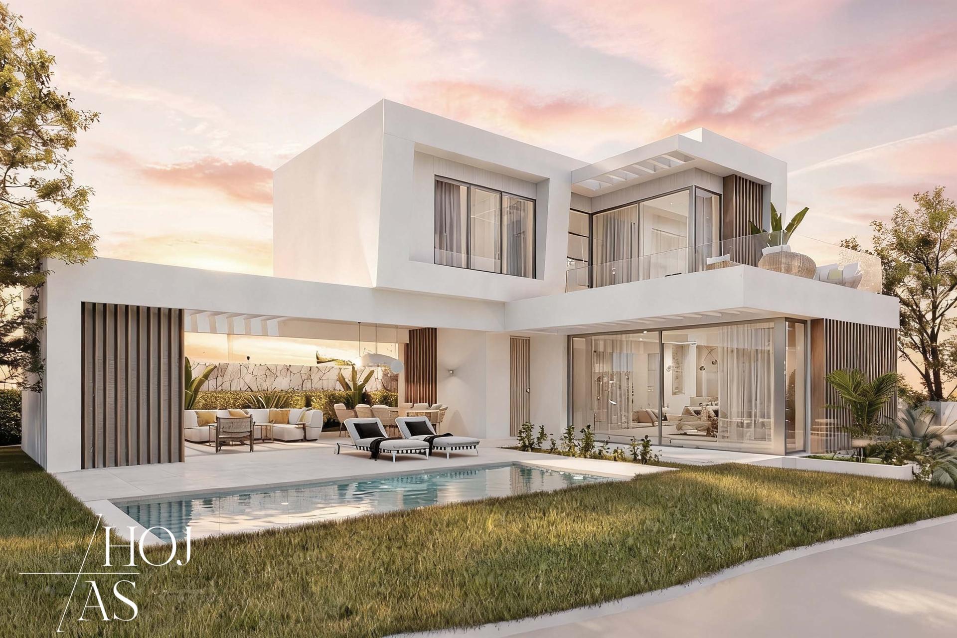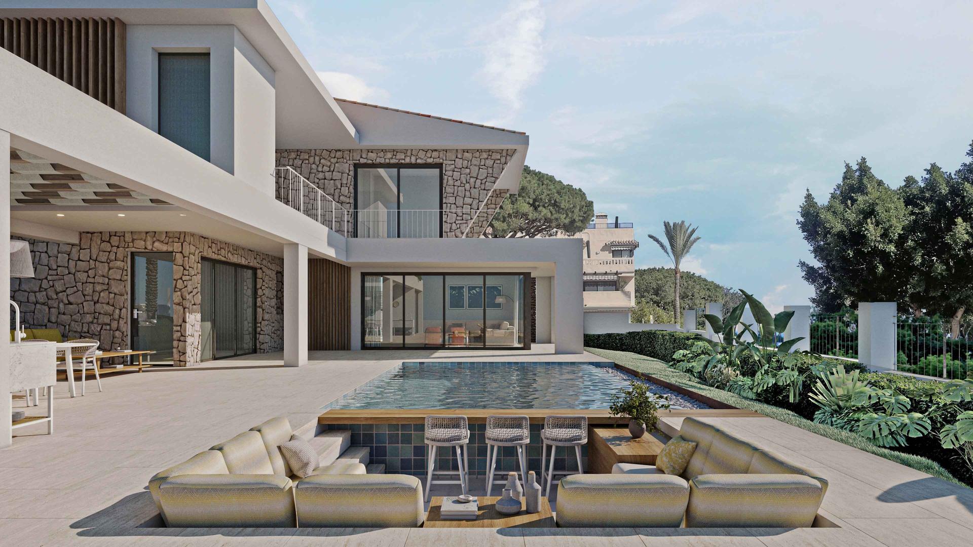 Ubicada en Elviria, Marbella, la villa se configura en forma de “L” alrededor de una piscina, potenciando las vistas y la conexión con los espacios exteriores. El diseño armoniza elementos arquitectónicos tradicionales con soluciones contemporáneas, destacando una gran pérgola que establece un diálogo constante entre interior y exterior, enriqueciendo la experiencia residencial.