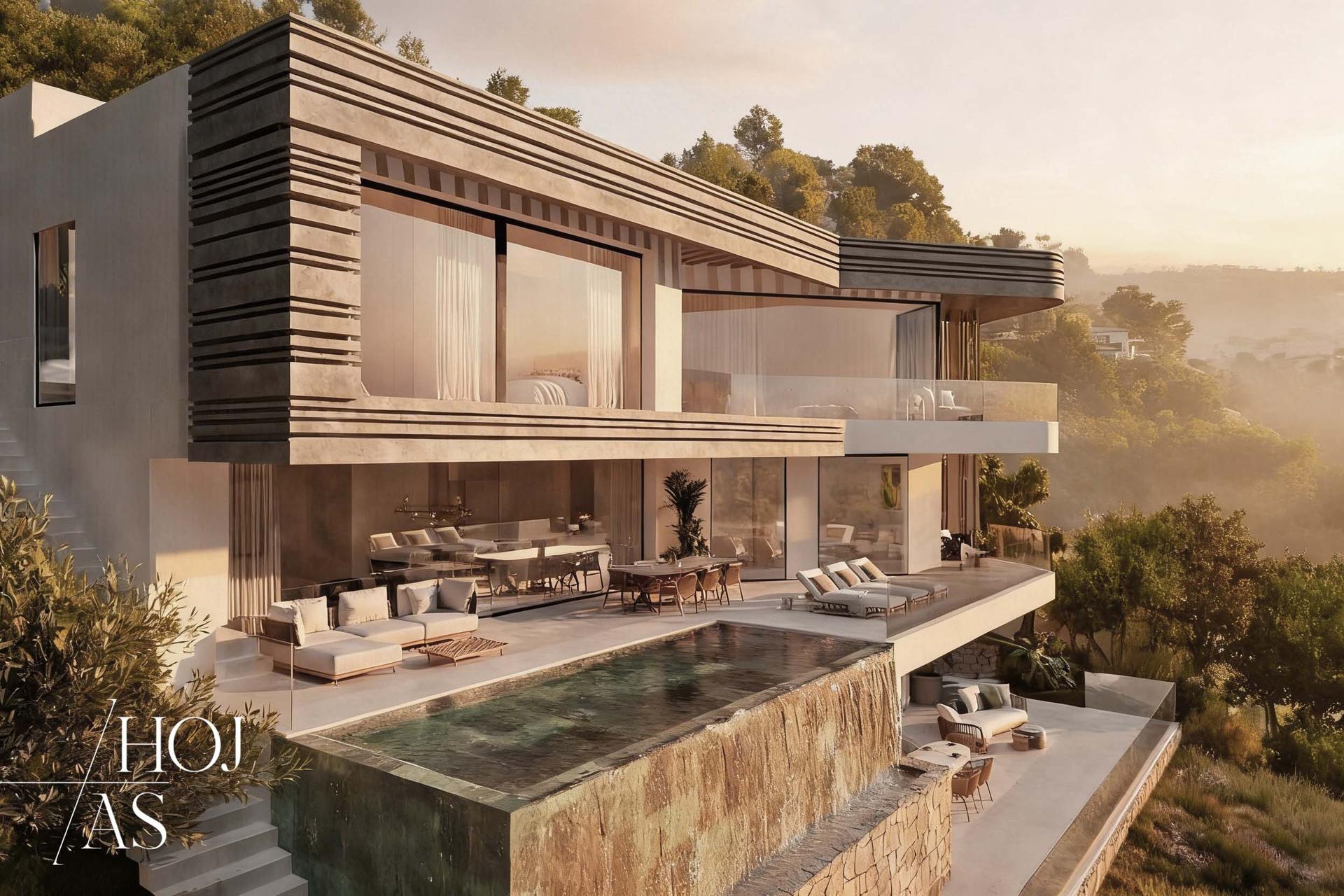La villa se desarrolla en una parcela de fuerte pendiente, integrándose de manera armónica con el paisaje mediante un diseño moderno y contemporáneo. Un gran marco arquitectónico enmarca las vistas panorámicas, estableciendo un diálogo constante entre interior y exterior.