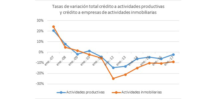 La cartera de créditos a empresas dedicadas a actividades inmobiliarias cayó más de 10.800 millones de euros entre 2016 y 2017, así se extrae del informe “Evolución del crédito a actividades productivas en España por sectores de actividad”, publicado por la consultora especialista en gestión del riesgo de crédito, AIS Group.